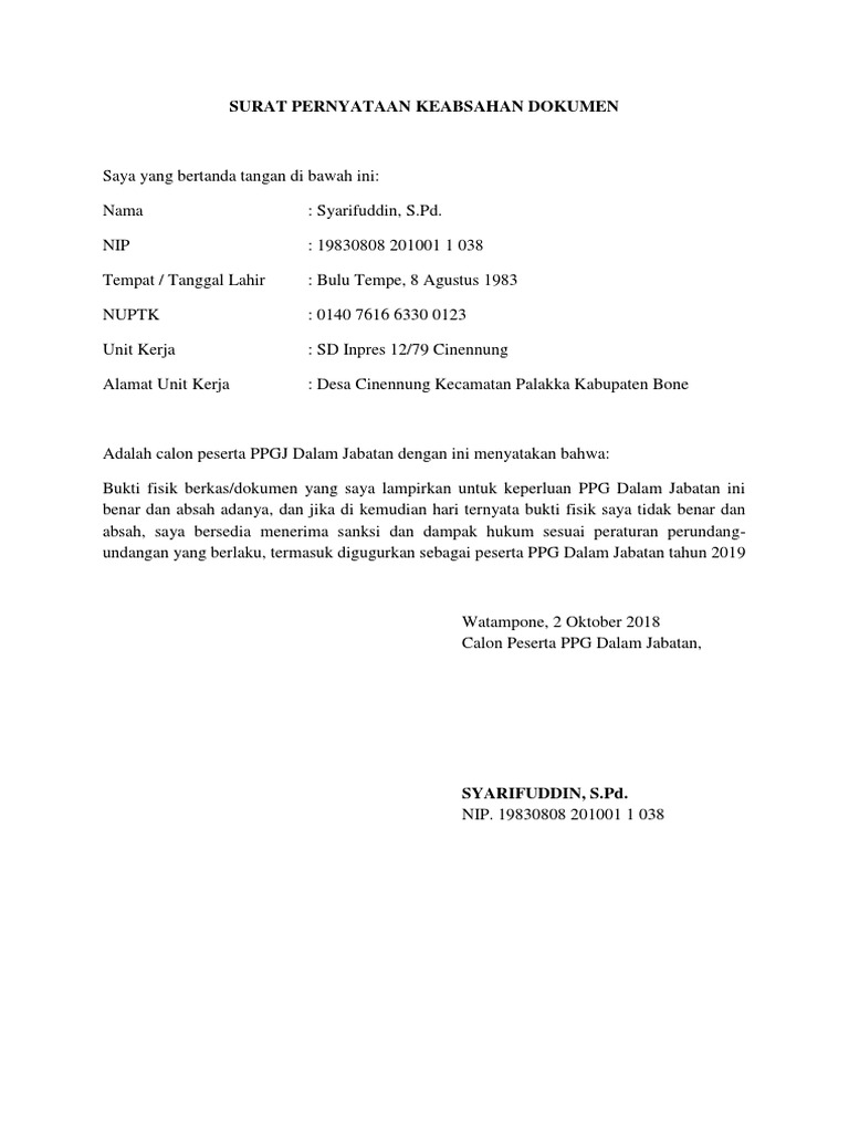Surat Pernyataan Keaslian Dokumen from imgv2-1-f.scribdassets.com Apabila diperlukan, saya bersedia memberikan. Dokumen atau bukti fisik untuk ppg akan di cek secara langsung ke absahannya atau kebenarannya oleh asesor. Surat pernyataan adalah surat yang dibuat oleh seseorang yang berisi pernyataan dirinya atau menerangkan orang lain bahwa orang tersebut materai dalam surat pernyataan berfungsi untuk menambah keabsahan berkas atau surat dan terikat hukum. Bagi anda calon peserta ppg dalam jabatan tahun 2019 merupakan kabar gembira hal ini berkaitan dengan pemanggilan peserta calon ppg tahun 2019 guna melengkapi berkas. Surat pernyataan pertanggungjawaban mutlak tentang keabsahan dokumen dari orangtua/wali calon siswa baru bermeterai rp 6.000. Surat pernyataan keabsahan dan kebenaran dokumensurat pernyataan#suratpernyataan#suratpernyataankeabsahandankebenarandokumen#suratsuratpenting. Saya yang bertanda tangan di bawah ini saya bersedia didiskualifikasi sebagai pendaftar dan menerima sanksi/diproses sesuai prosedur dan ketentuan hukum yang berlaku apabila dokumen, data, informasi, dan/atau keterangan tersebut tidak. Berikut ini adalah sebuah contoh surat pernyataan kebenaran dan keabsahan dokumen lingkungan yang bisa anda jadikan bahan referensi.